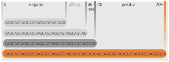Abb. 4 Bei einer ermittelten CAG-Länge von unter 27-Wiederholungen spricht man von einem negativen Befund. CAG-Blöcke mit 40 oder mehr Wiederholungen (orange) führen ohne Ausnahme zur Erkrankung. Bei Kopien zwischen 36 und 39 CAG spricht man von reduzierter Penetranz (RP), nicht alle Menschen die eine dieser Längen tragen werden auch erkranken. Kopien mit sog. intermediären Längen (IL) zwischen 27 und 35 CAG sind nicht mit Krankheitssymptomen assoziiert; für Nachfahren besteht jedoch ein erhöhtes Risiko einer Expansion in den pathologischen Bereich.