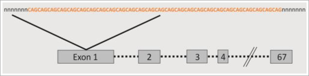Abb. 1 CAG-Wiederholungen im Huntingtin-Gen (HTT). Im Exon 1 des Gens findet sich das Wiederholungsmotiv (CAG)n. Eine übermäßige Wiederholung der drei Basen führt zu M. Huntington.